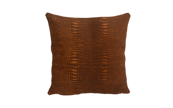 Coussin en cuir suède chocolat et camel orangé imprimé alligator