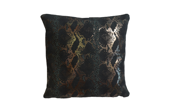 Coussin en cuir bleu pétrole et argent imprimé python