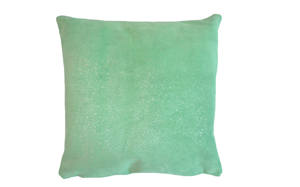 Housse de coussin en cuir de veau suède vert d'eau pailleté sur les deux faces.