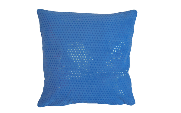 Housse de coussin en cuir de veau suède bleu électrique imprimé pois brillants sur les deux faces.