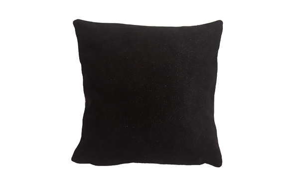 Housse de coussin en cuir d'agneau velours noir avec motifs métallisés sur une face et cuir d'agneau velours noir pailleté sur l'autre face.