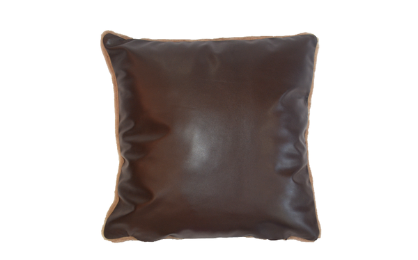 Housse de coussin en cuir d'agneau lainé beige foncé pour une face et cuir nappa marron pour l'autre face.
